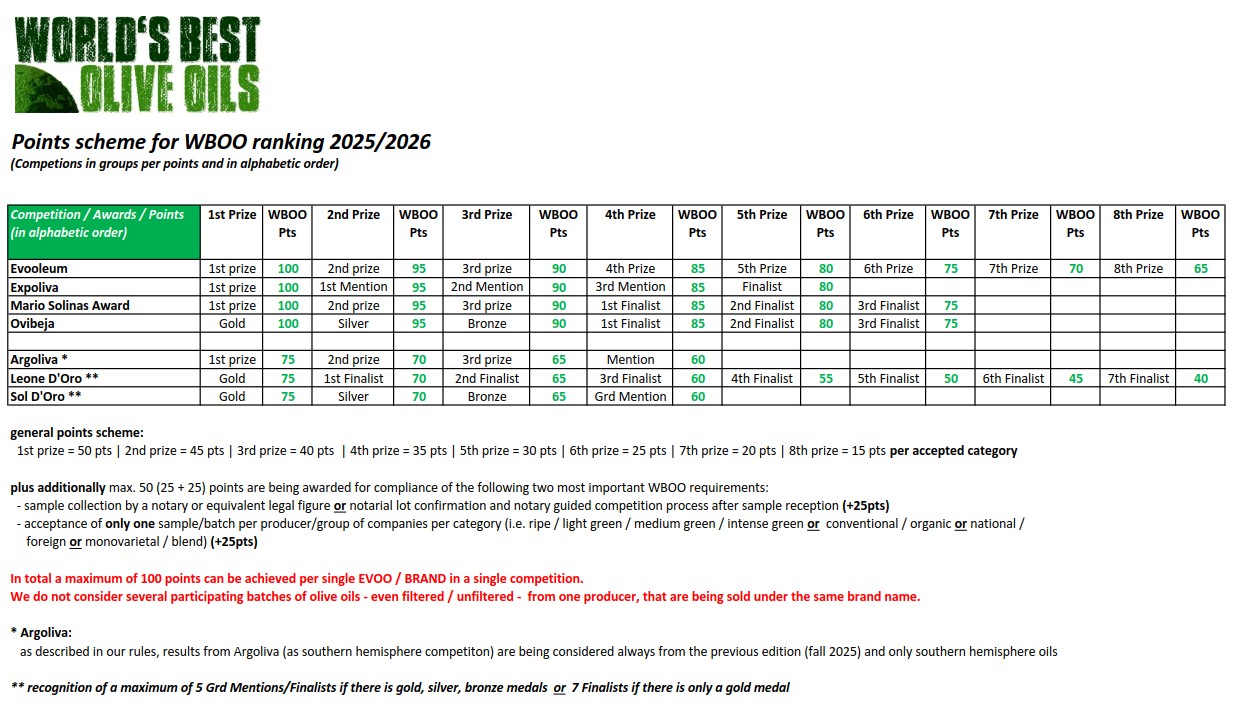 The results of each and every competition enter in our ranking following the same points scheme. Our points scheme firstly provides 20-19-18-17-16-15-14-13 points according to the rank of an olive oil in each competition and gives extra points for complying with the two most important criteria due to the strictness of each and every competition. This leads to a maximum of 20 (10+10) additional points for a single competition, making (40) the maximum of points to gained from one competition. In competitions where the organizers provide result lists for conventional and organic olive oils, points are being awarded to the winning conventional and organic olive oils. Results of the individual olive oils from the purely organic competitions are only considered for the ranking of the world's best organic olive oils.